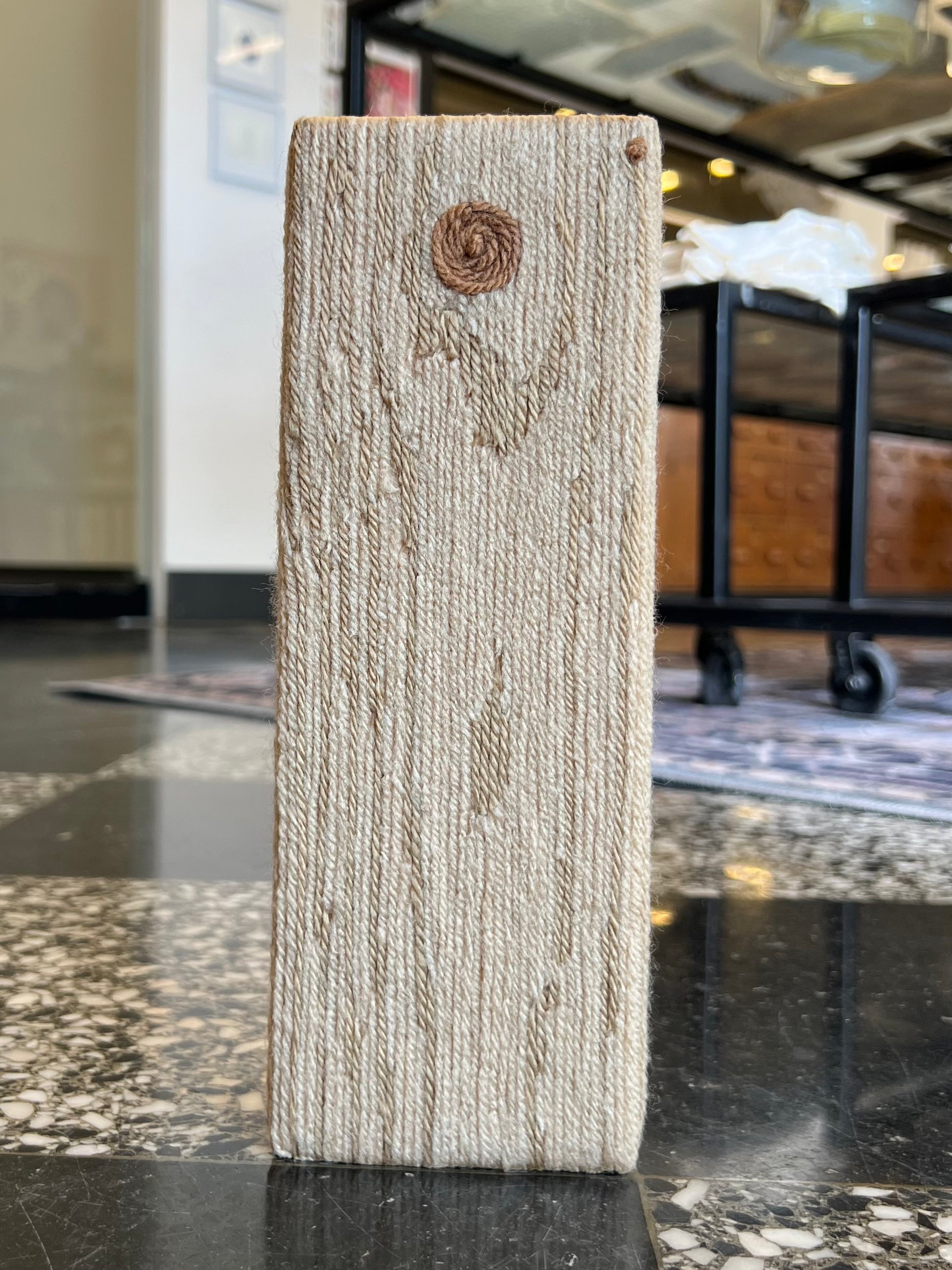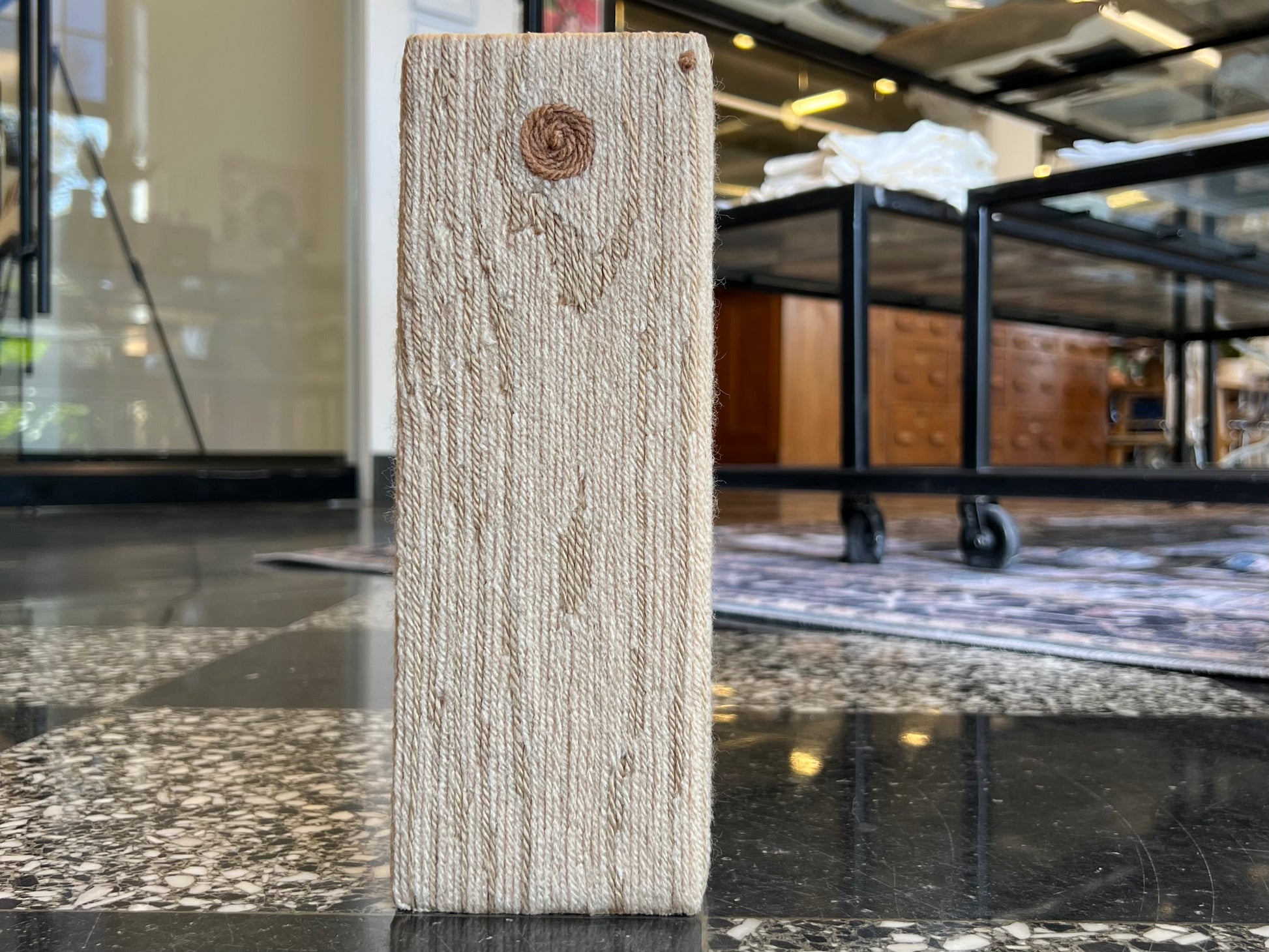 - "The Grain Series uses yarn to trace the natural grain of found wood... Inspired by theater, drag, club, and spaces of illusion, the work alludes to narratives of gender in material and uses that history to confront assumed polarities. It is both hard and soft, structured and loose, masculine and feminine." -Quynn Douglas Dale