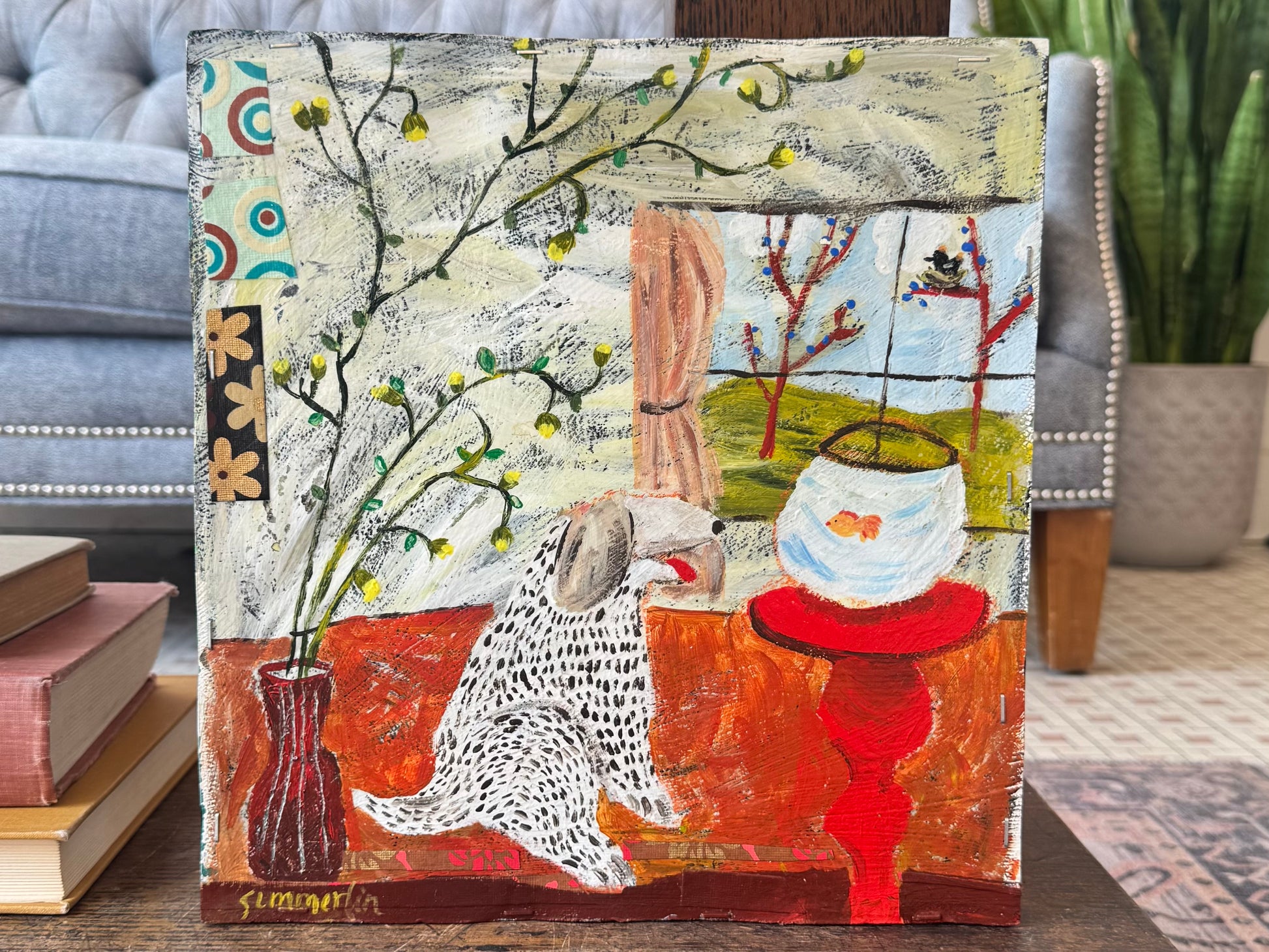 - Acrylic and mixed media on hardboard panel