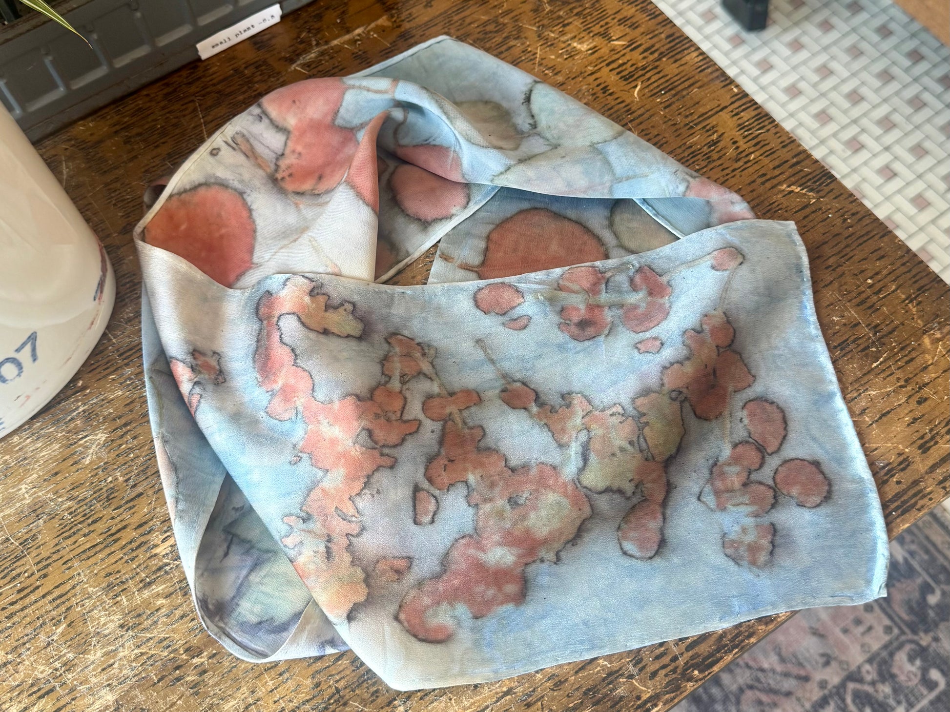 - Leaves are placed on the dampened scarf and covered with a cloth dipped in an iron water solution. The scarf is wrapped tightly around a wood dowel, covered in plastic, and steamed. Natural colors may be added for variety. After it dries, the scarf is carefully rinsed and ironed.
