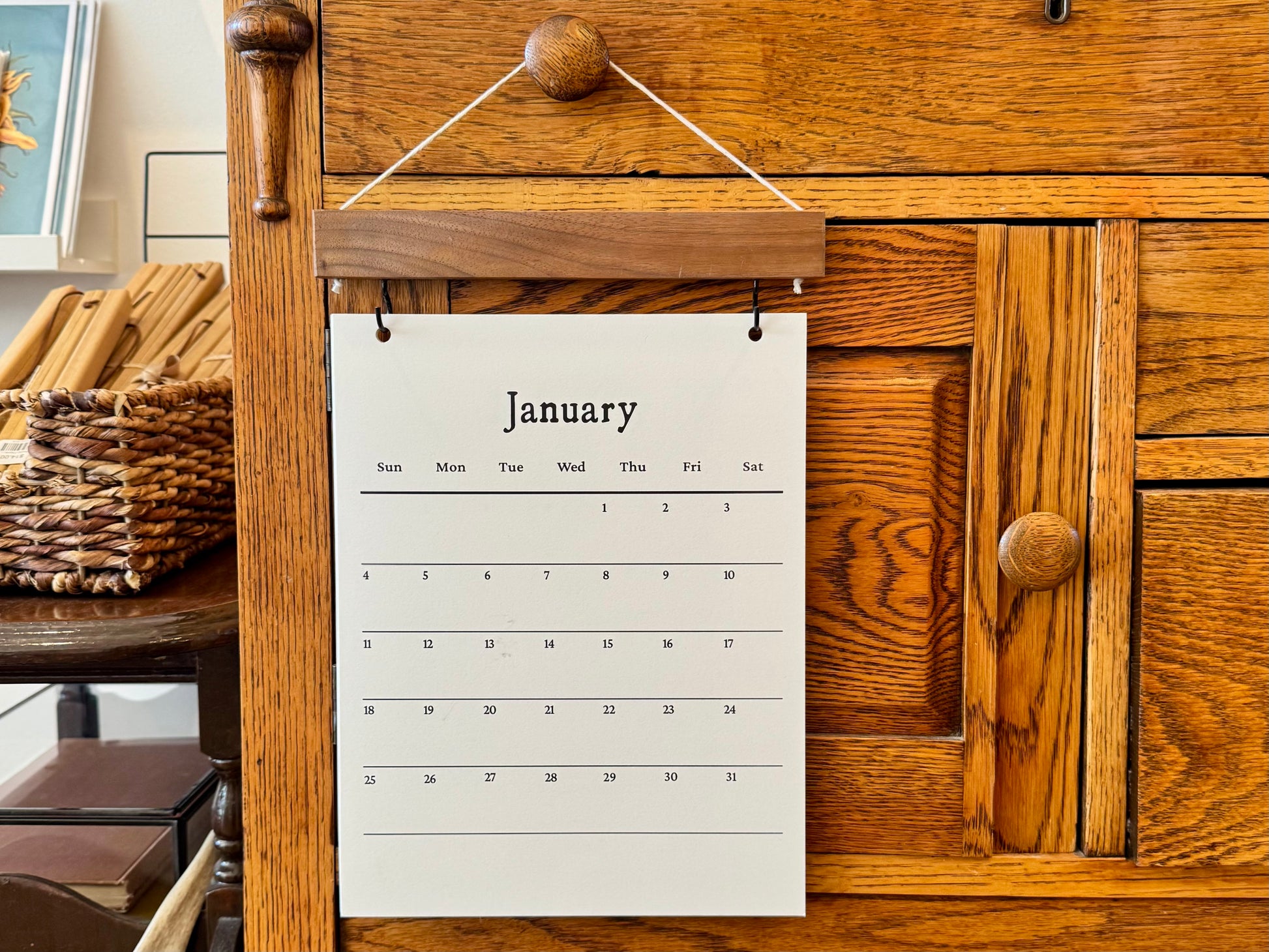 - Dimensions: Calendar: 8.5" x 11" Walnut hanger: .5" x 9"