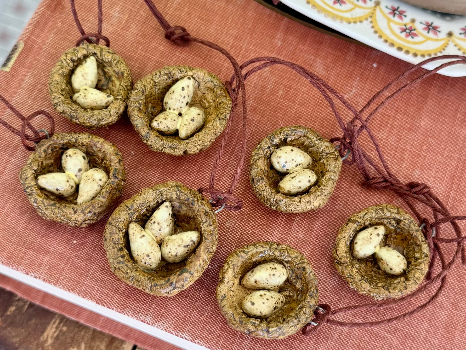 - Hand formed little bird's nest ornament with 2 or 3 eggs