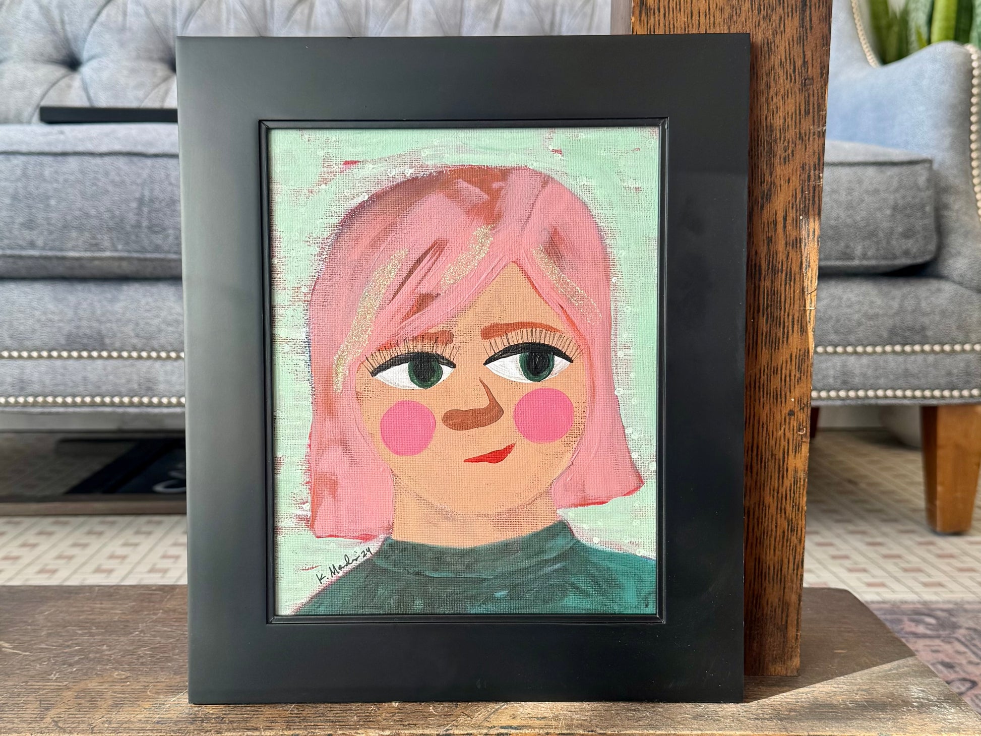 - Acrylic painting on canvas panel with glitter detail (sealed, so it won't spread)