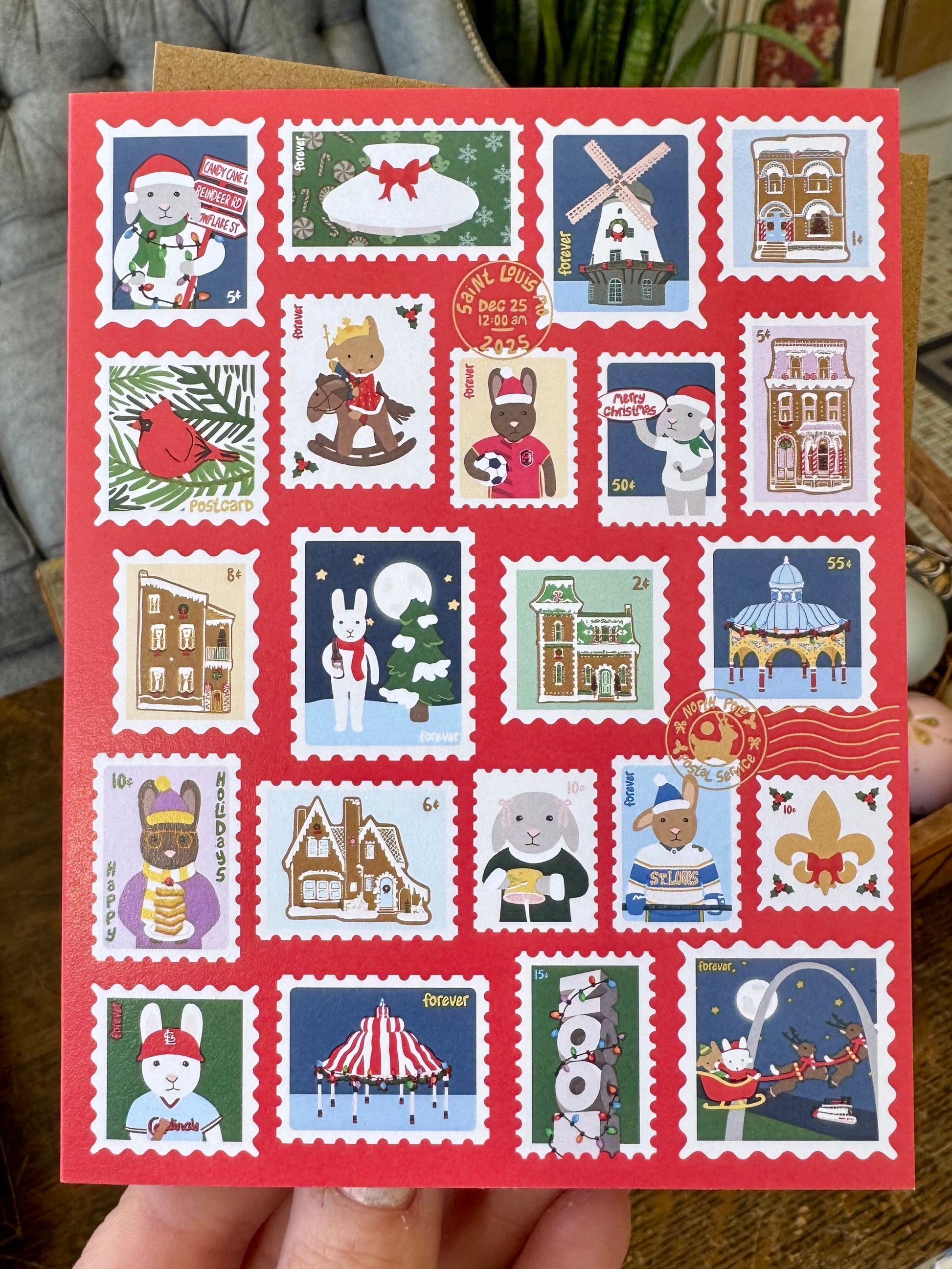 - Greeting Card featuring STL's favorite spots as postage stamps